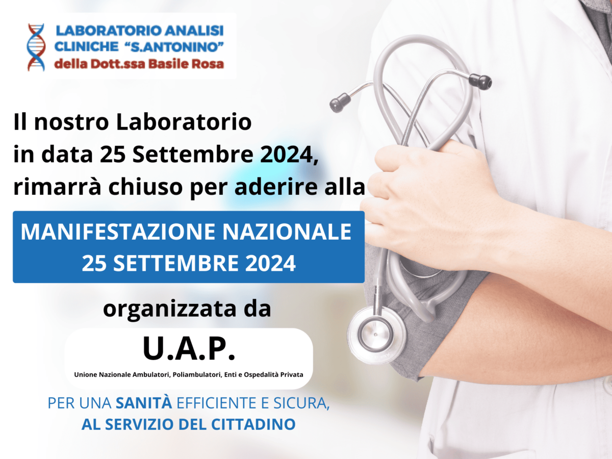 Il nostro Laboratorio in data 25 Settembre 2024, rimarrà chiuso per aderire alla MANIFESTAZIONE NAZIONALE 25 SETTEMBRE 2024, organizzata da U.A.P. (Unione Nazionale Ambulatori, Poliambulatori, Enti e Ospedalità) privata PER UNA SANITÀ EFFICIENTE E SICURA, AL SERVIZIO DEL CITTADINO.